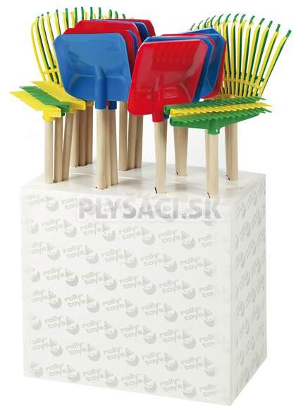 Záhradné detské náradie ROLLY TOYS. Sada záhradného náradia 24 ks (lopatky, Hrabko, švédske hrable). Rôzne farby, kombinácia plast - drevená násada. Krabica slúži ako skladovacie stojan. Cena za jeden ks